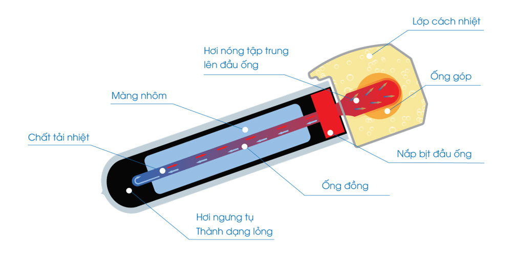 - Công nghệ mạ 7 lớp, với lớp trong cùng là đồng mạ Titanium, gắn chặt vào thành ống, giúp tăng tốc độ hấp thụ, đạt hiệu suất trên 98%