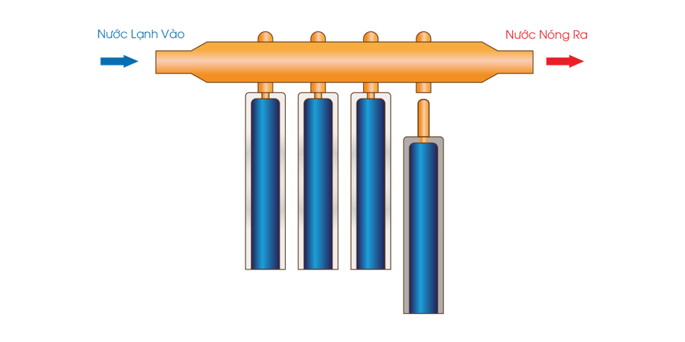 - Nước lạnh đi xuống dưới hệ thống và được làm nóng khi di chuyển qua các ống — nguyên lý đối lưu tự nhiên hoặc cưỡng bức sẽ đưa nước nóng lên bình chứa.