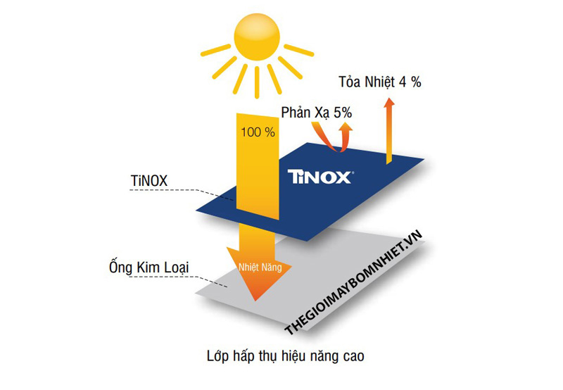 Lớp hấp thụ nhiệt này được sản xuất tại Đức, ứng dụng công nghệ blue titanium chọn lọc, có tác dụng hấp thụ hơn 95% ánh sáng mặt trời và phản xạ chưa đến 5%, tối ưu hóa hiệu suất hoạt động.
