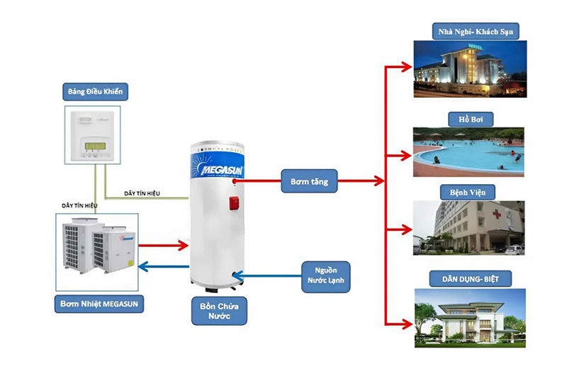- Nước lạnh được bơm tăng áp đẩy trực tiếp vào bồn bảo ôn inox Megasun. Từ đây, nước được dẫn đến bộ phận trao đổi nhiệt của các thiết bị gia nhiệt như bơm nhiệt (Heat Pump), tấm thu năng lượng mặt trời hoặc điện trở gia nhiệt.
