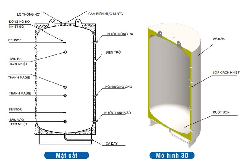 • Nguồn gia nhiệt: Tấm thu năng lượng mặt trời bơm nhiệt, điện trở, lò hơi,…