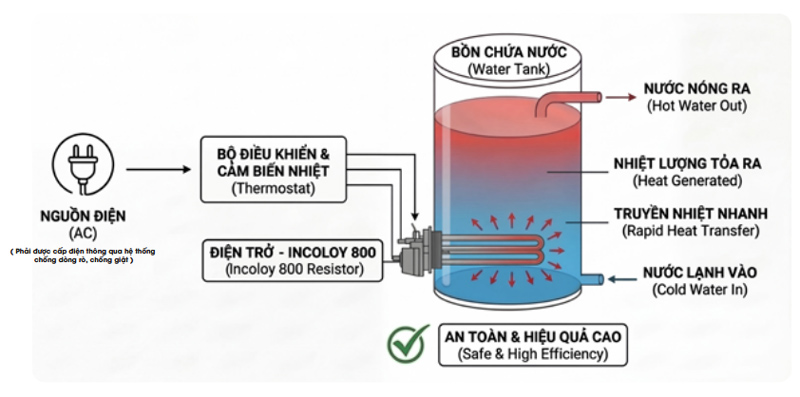 Nguyên tắc quan trọng: Điện trở phải luôn ngập hoàn toàn trong nước khi hoạt động để tránh cháy khô (dry burn).